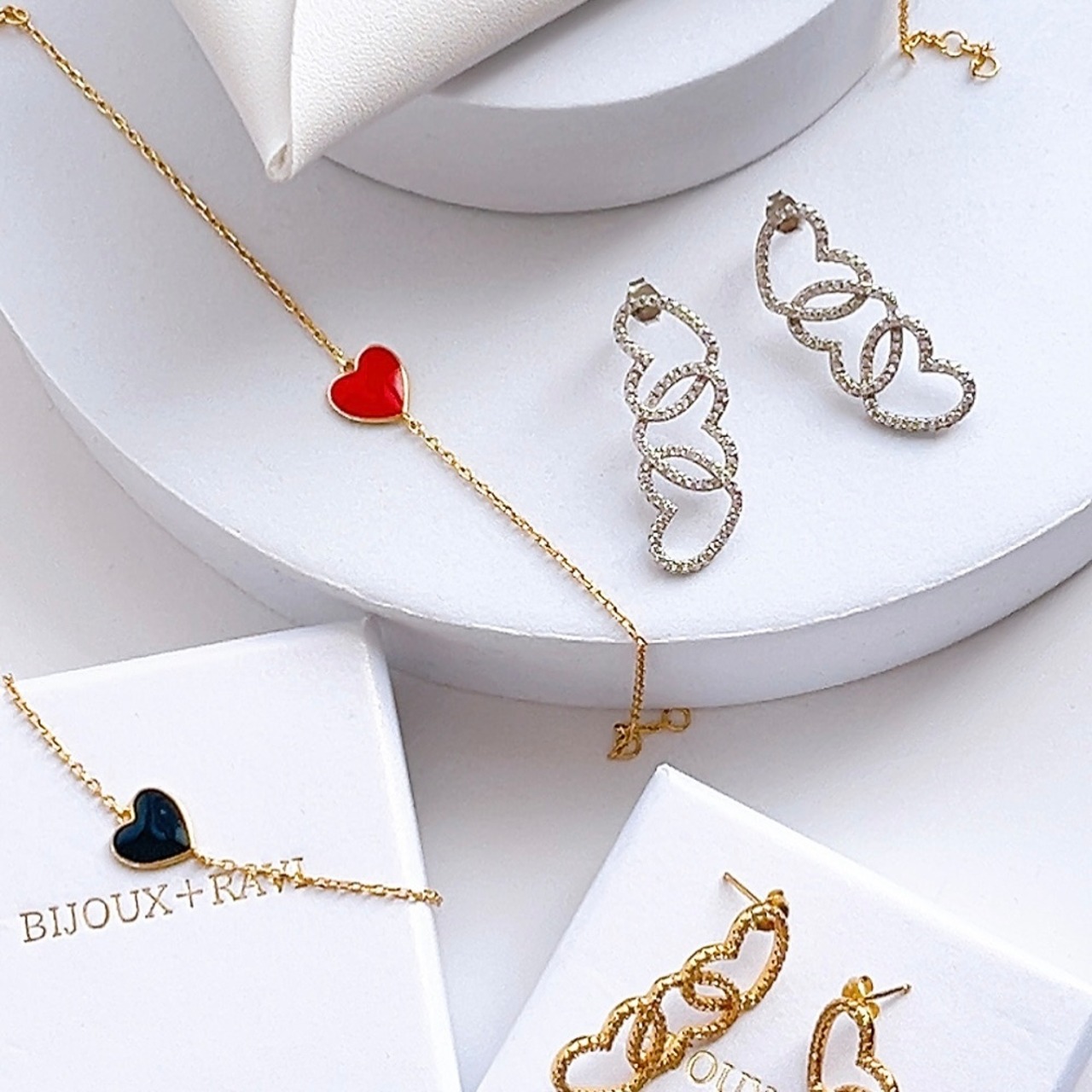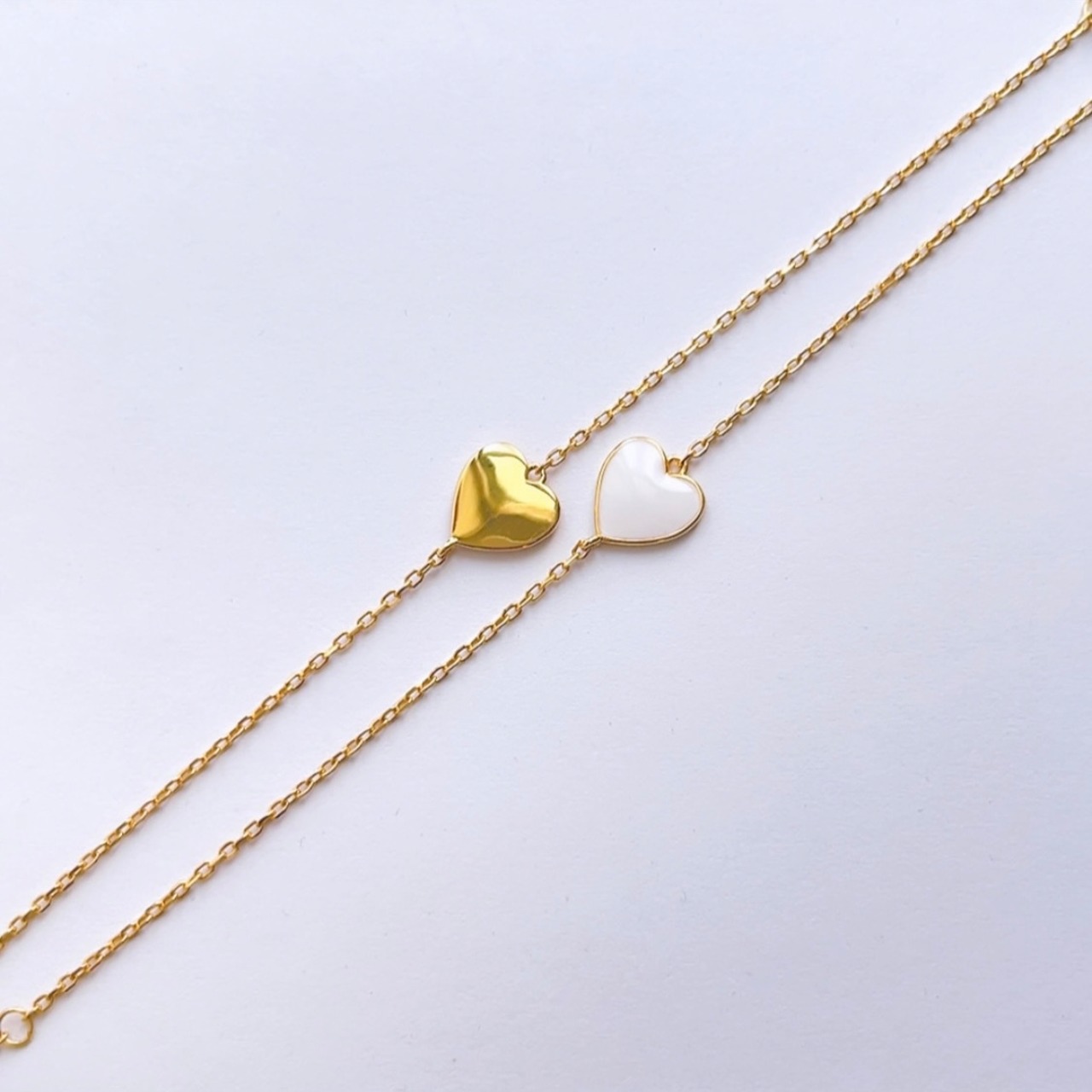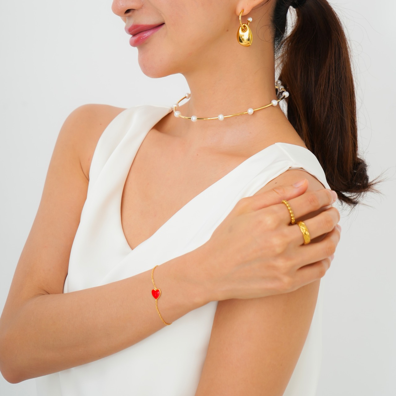艶めくエナメルハートが主役の、華奢なゴールドチェーンブレスレットです。