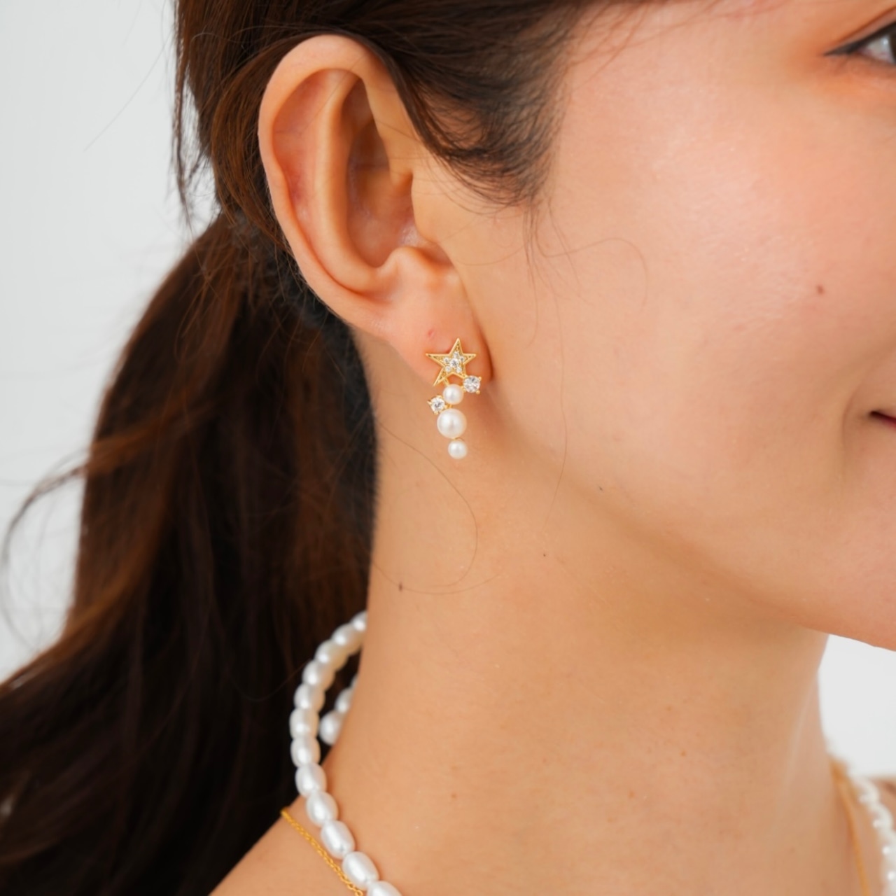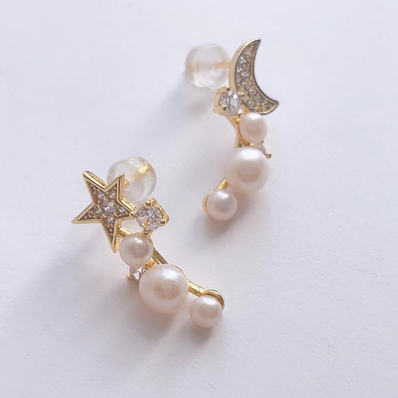 夜空に輝く星と月をイメージした、大人可愛いMoon & Star Pearl ピアス。