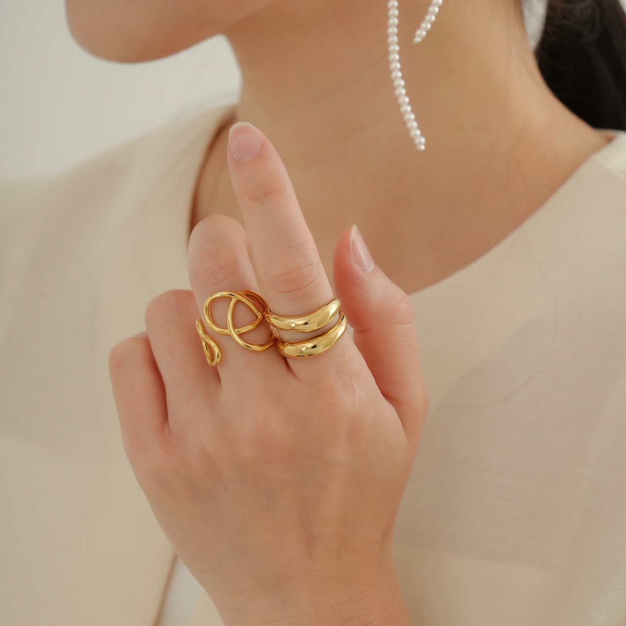 シンプルリングとの重ね付けもおすすめ。